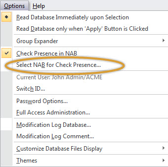 | NOTE | The NAB Presence Checker feature can also be used via the NAB Group Navigator Beware however, that the NAB selected in the Presence Checker (Options menu) may be different from the NAB selected in the Group Navigator (Tools menu) |