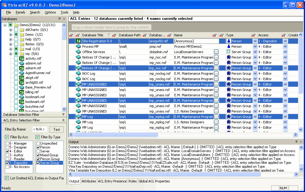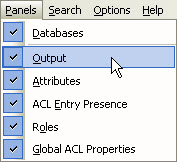 The left-hand panel of the main screen is calledDatabases, and from here you use checkboxes to select the databases you'd like to work with. Once a selection is made, any ACL information will appear in theACL Entriessection (situated, by default, on the upper right-hand side of aclEZ). TheACL Entriespane uses thegridinterface. You'll find five tabbed panels in the lower right-hand side of the main screen:Output, Attributes, Roles, Global ACL PropertiesandACL Entry Presence.