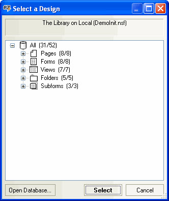 | TIP | When you click Select a Design, the designs you'll initially see listed are those found in the database currently open in actionBarEZ. However, the dialog also provides an Open Database button which lets you choose a different database, in case you'd like to copy action bar properties from a design in another application. |