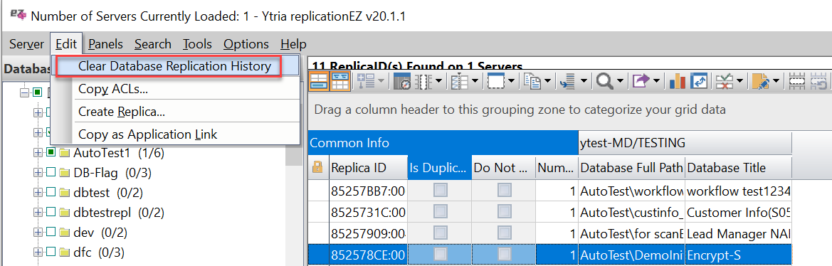 Clear Replication History for Selected Databases