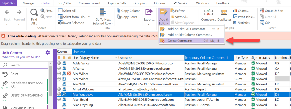 Remove all permanent comments on displayName on selected rows: