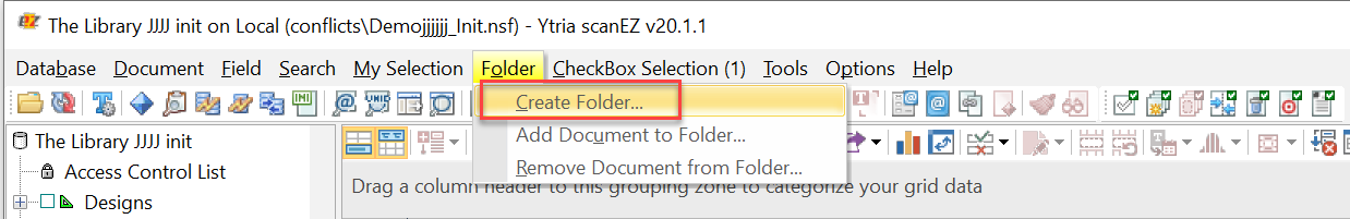In the script above, the database "maildbtest1.nsf" will be loaded in scanEZ. The action CreateFolder will then trigger the a create folder operation. The tag attributes are defined to produce the same results as the example syntax shown in the beginning of this page. The name of the new folder will be "NewFolder2". It will be private and the inheritance will be copied from the folder "NewFolder1". This folder name is selected in the default manner (name & alias) that is, the folder only has a name "NewFolder1" with no aliases defined.