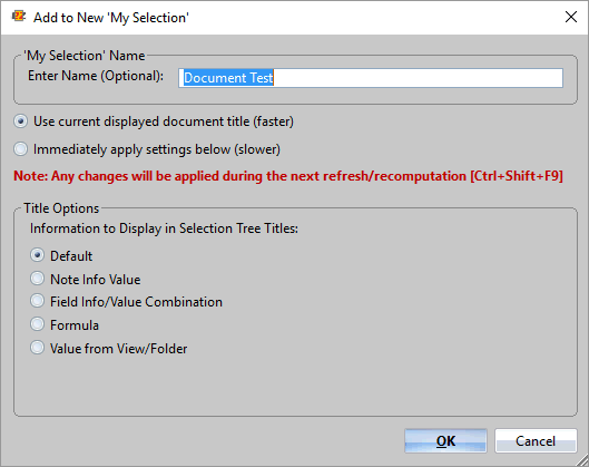 In the script above, two new My Selection folders will be made. One will contain the Documents of type 'Memo' as well as 3 documents specified by their Note IDs. The displayed title of the documents in this folder will be the value of the Field 'Size'. The second MySelection folder will be made from the tree category who was last in focus, in this case the 'Appointments' category. The displayed title of the documents in this My Selection folder will be the value found in the Field 'RequiredAttendees'.