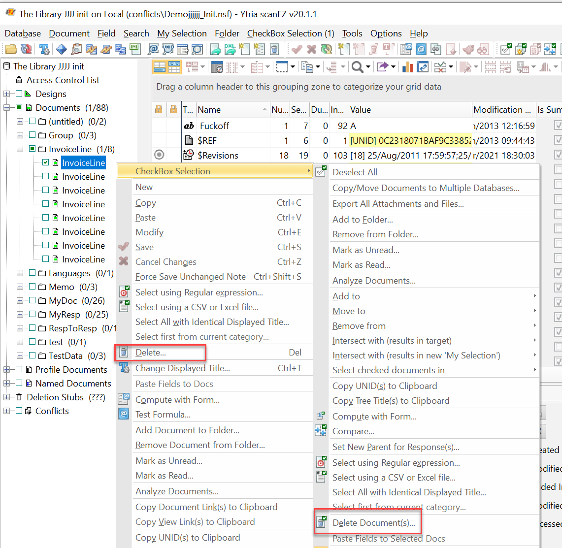 In the script above, the database 'MailTest.nsf' will be loaded into scanEZ and the focus placed on the Document category "Appointment" in the selection tree. The displayed titles will be changed for all documents within this category using the value of the item named "AppointmentType". A Regex search will be launched on these documents' titles to find all that correspond to the title "3"; they will be CheckBox selected. The Delete action will then delete all documents selected, as well as any responses, without creating deletion stubs.