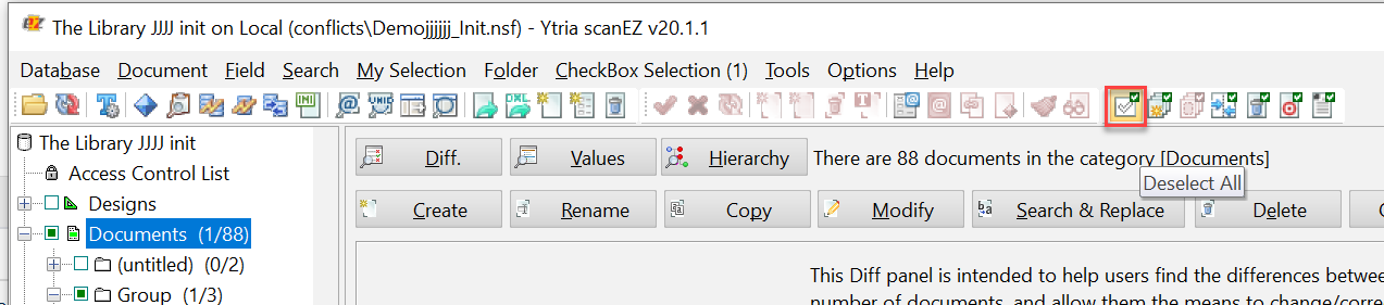 The Unselect action, along with the applicable SetParam options, lets you automate deselecting some or all documents and design elements within scanEZ's selection tree.