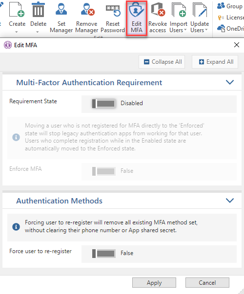 The SelectedEditUser function enables the automation of MFA data modification for the users selected in the grid.