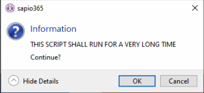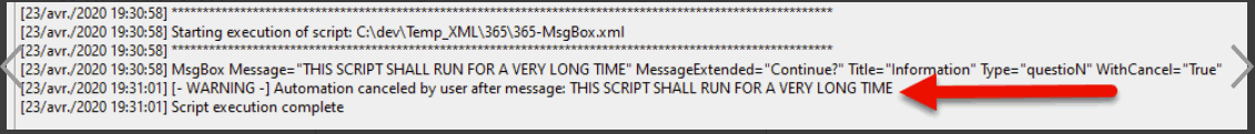 <MsgBox Title="Information" Message="THIS SCRIPT SHALL RUN FOR A VERY LONG TIME" MessageExtended="Continue?" Type="questioN" WithCancel="true"/>