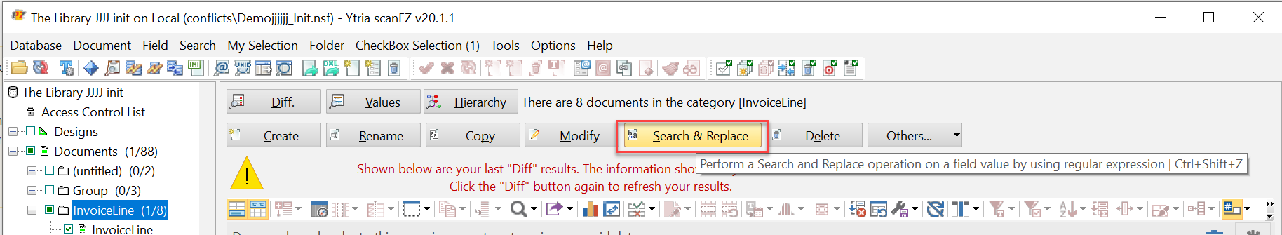 The SearchAndReplace action, along with the applicable SetParam child actions, lets you automate the Search & Replace operation launched by the 'Search & Replace' button found in the Diff/Values panel in scanEZ.