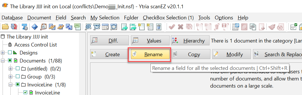 The RenameItems action, along with the applicable SetParam child actions, lets you automate the Rename Items process launched by clicking on the 'Rename' button found in the Diff/Values panel in scanEZ.