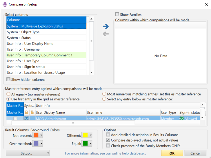 | Remove | Rows, Columns, All | Remove all 'Not Present' Family Member entries from the grid. Remove all comparison results columns / Remove both Attributes cannot be combined, only one can be chosen at a timeāsee detailed description |