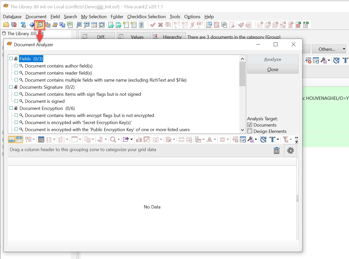 In the script above, the database "testdatabase.nsf" will be loaded. The Document Analyzer process will be launched using all tree options within the "Fields" and "Sum of Summarized Item Data" categories. The Analysis Target options of 'Design Elements' and 'Documents' will be selected. All rows (all documents and designs found) within the resulting grid will be selected and placed into a new My Selection folder.