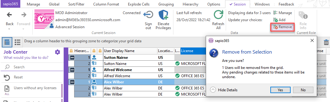 The SelectedRemoveFromSelection function automates the action of unloading the selected reference Users (or Groups or Sites) and their related data.