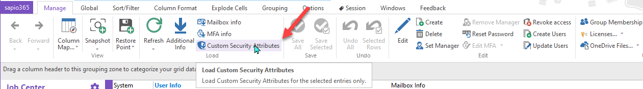 The SelectedUserLoadCustomSecurityAttributes function automates the action of loading Custom Security Attributes of selected users in the grid.