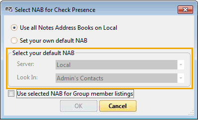 The attribute Current refers to the radio buttons at the top of the Select NAB for Check Presence dialog. <SelectNAB Current="True"/> selects Use all Notes Address Books on <Current NAB Server> option. The attributes Server and Database are not used in this case. <SelectNAB Current="False"/> is the default behavior. This is not mandatory and defining the Server and Database attributes will automatically proceed as if this option is selected.