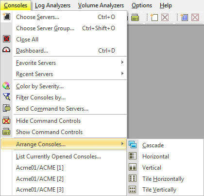 The 'Arrange Consoles…' option offers 5 different choices for arranging consoles. The action Arrange lets you automate the selection of these choices as well as restore default window positions and sizes.