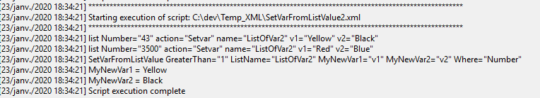 The first action in the list (according to order in the XML script) that matches the WHERE filter value sets the new variable(s). In the following example, the new variables MyNewVar1 and MyNewVar2are respectively set to YellowandBlack: