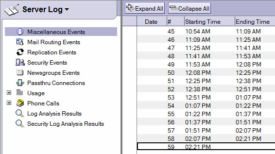 Log.nsf event categories opened in the IBM Notes client.