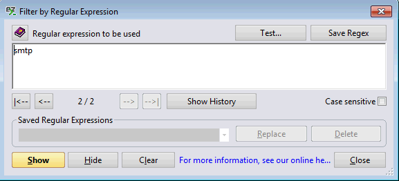 | Filter by Regular Expression options: You can refer to the following page for more information about the Regular Expression window options. Show: Shows the selected regex filtered in the console and closes the dialog. Hide: Hides the selected regex filtered in the console and closes the dialog. Clear: Clears the regex filter and closes the dialog. Close: Closes the dialog. If any new regex is entered, it won't be applied. |