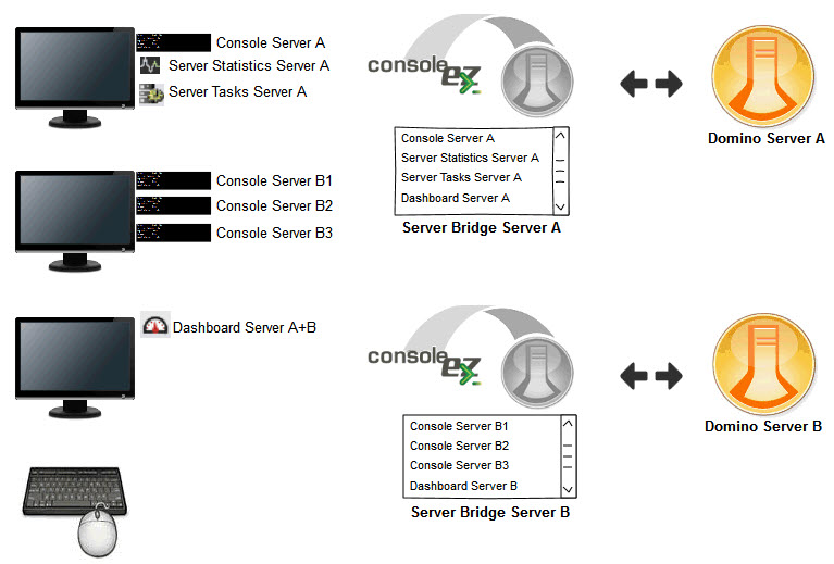 The Server Bridge contacts the selected Domino server, stores the information received, and then responds to requests from Consoles, Server Tasks, etc...