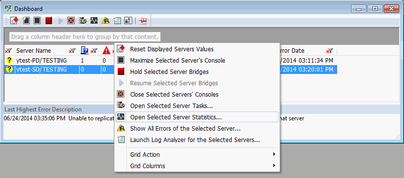 Use the toolbar's Dashboard right-click options to open the selected servers' statistics.