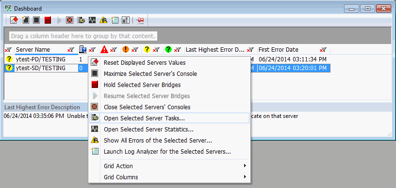 Use the toolbar's Dashboard Right-Click options to open the selected server(s) tasks.
