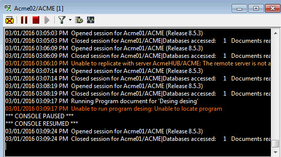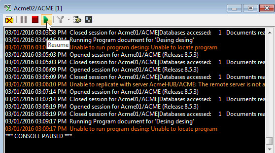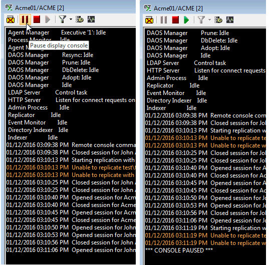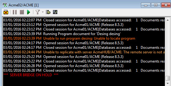 The Pause button pauses the displayed messages in the console. Although paused, the Server Bridge keeps sending requests to the Domino server.