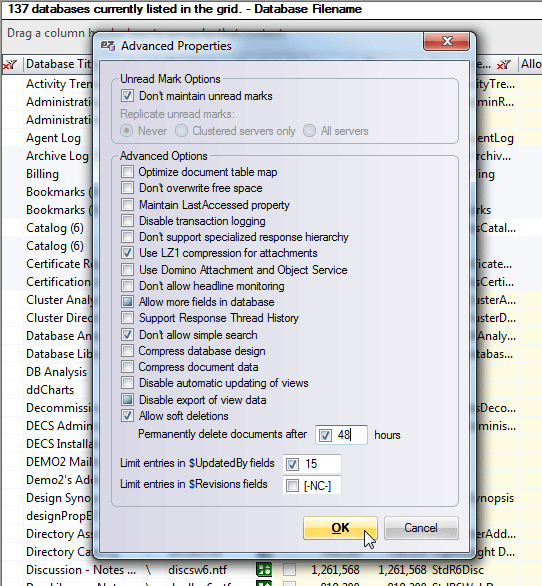 This dialog lets you mass-edit the properties that correspond with those found in the 'Advanced' tab of the Database Properties dialog in Lotus Notes.