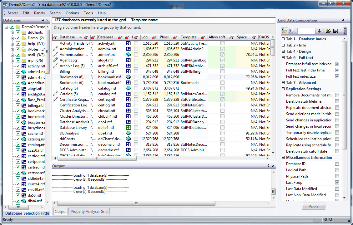 The Grid Data Compositionpanel, which lets you choose which properties to show in the grid, is on the right-hand side. You'll find theOutputpanel on the lower part of the screen, this is used to display logged information such as errors. TheProperty Analyzer Gridcan also be found in the lower section of the databaseEZ main screen. *The panel positions stated are the defaults. databaseEZ offers a docking interface where you can drag-and-drop to rearrange any of the panels as describedhere; the Grid pane is fixed.