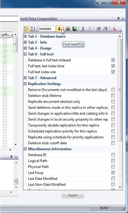 | NOTE | The Grid Data Composition panel works in a different manner than the standard column filters available in all grid windows. The standard grid filters 'hide' information that has already been loaded. In contrast, the Grid Data Composition panel lets you choose 'in advance' what information you wish to be displayed in your grid. Therefore, when dealing with large data sets in the Main Grid, disabling all but the essential columns improves the performance of databaseEZ. This lightens the load on the grid itself, although all information is still loaded in the tool. |