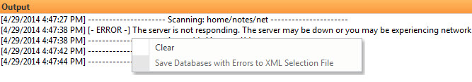 - Save Databases with Errors to XML Selection File: If the Output panel contains any databases with errors, you may export a list of them in XML file format. You can then load this XML file by selecting Server > Load Saved Selection and analyze possible problems encountered on those databases. If there are no errors this function will be grayed out.