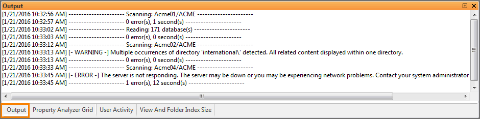 The Output Panel in databaseEZ is used for reporting the errors and recording the events encountered by the application: e.g. access errors, the number of databases read, etc.