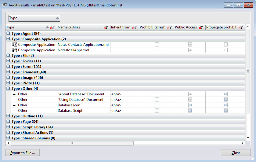 The columns available in the Audit Results grid match the information in the Design Properties window in IBM Domino Designer.