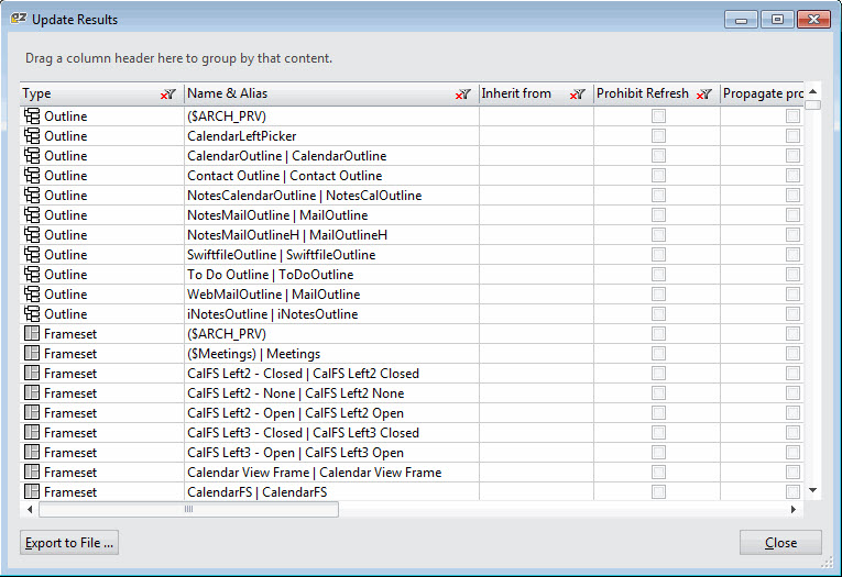 The columns available in the Update Results grid match the options in the Update Properties window as well as the information in the IBM Domino Designer Design Properties window.