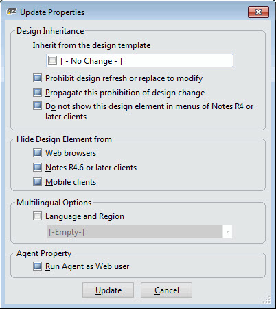 The Update action opens the Update Properties dialog. This allows you to modify design element properties on your selected database. Then the Update Results grid will display you the state of the design element properties for each selected design element.