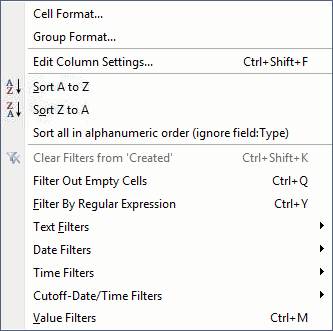 | NOTE | This section refers to data manipulation actions available through column headers. See this page for information about Cell and Group Formatting. See this page for information about the Grid Manager and its relation to columns. |