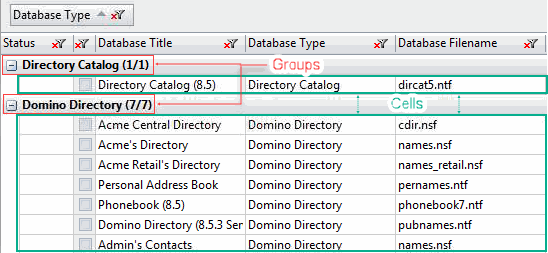 The following example illustrates the difference between cells and groups in the same grid.