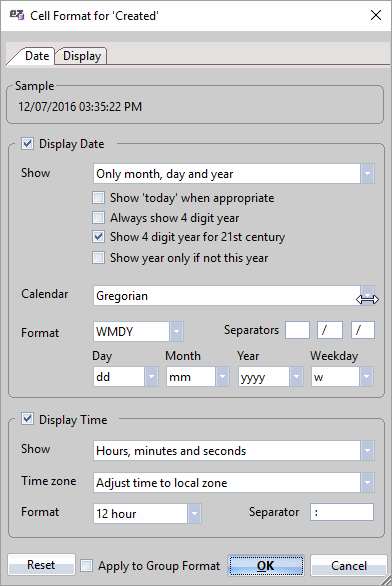 Date columns offer both 'Display' and 'Date' preferences, letting you set the color and alignment of the text within the column, as well as a full range of Date display options.
