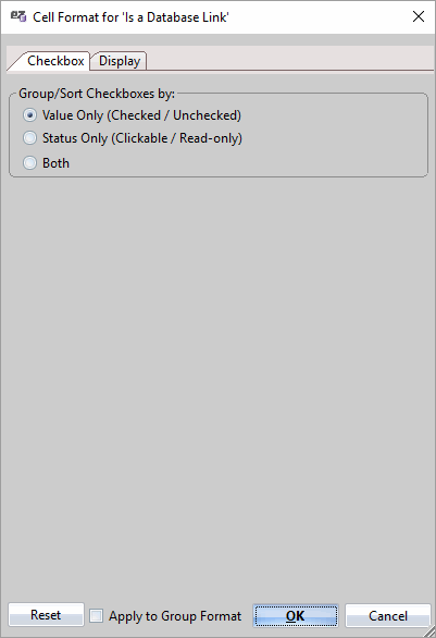 Checkbox columns offer both 'Checkbox' and 'Display' preferences, letting you set the color and alignment of the text within the column, as well as the Group/Sort mechanics used on the column's checkboxes.