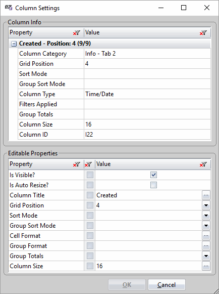 Accessed by selecting the column header option 'Edit Column Settingsā¦', the Column Settings dialog gives you an aggregate view of the Column Information for the given column as well as an aggregate selection of editable properties also found in the Grid Manager.