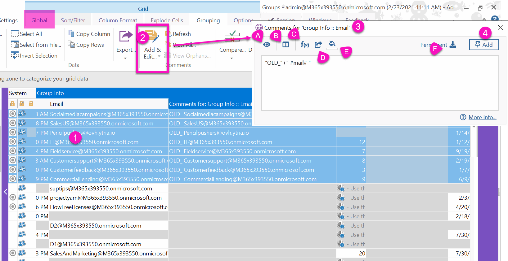 Comments can be used as sticky notes, but you can also use them as calculated columns using Java scripts and reference columns. In the example and image below, a prefix "OLD_" is being added to emails.