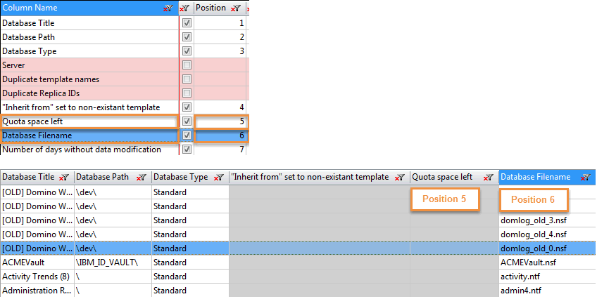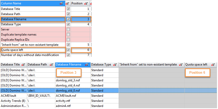 When we move the column Database Filename to Quota space left, we can see that its Position changes.
