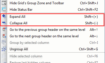 'Collapse All': This option, selected either by its toolbar button, the context menu option found in the 'Grid Tools & Options' submenu (shown below), or theShift+-key command, will collapse all categories, leaving only their category headers visible.