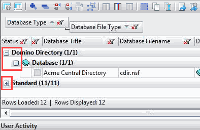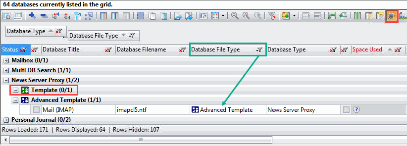 In the example above, a text filter has been applied to the column Database File Type, leaving only the entries matching "Advanced Template" in the grid. By activating the option 'Show Empty Groups', categories that would normally be hidden due to the applied filters will be made visible in the grid.