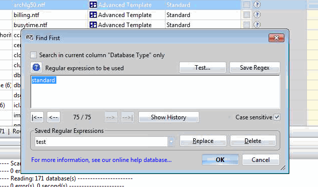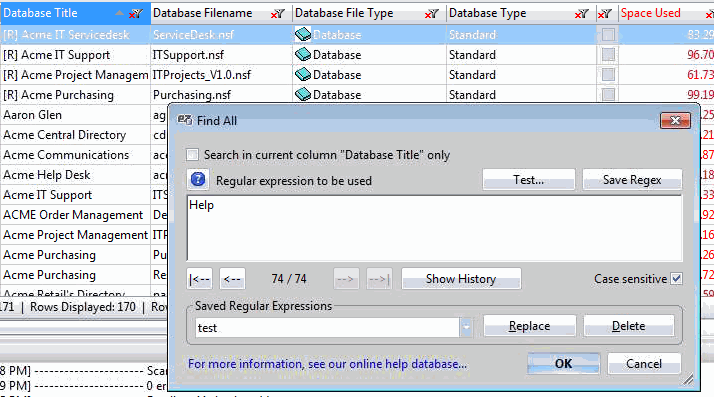 In the example shown above, clicking 'OK' will select all row entries that contain the string "Help" in any cell. Note that 'Case sensitive' is selected.