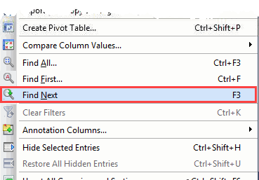 This option will remain inactive until an entry is selected. It will find and select the next matching entry in the grid.