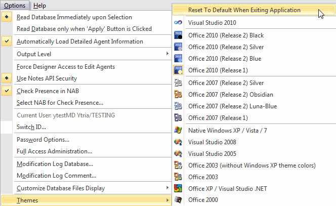 The Themes menu also offers the Reset to Default When Exiting Application command.
