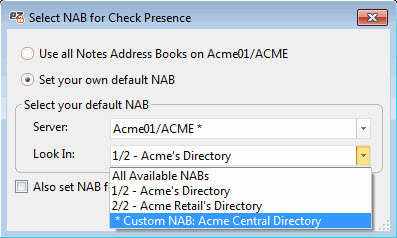 This option is enabled by default. Unlike the Group Navigator, the 'Check Presence in NAB' option does not use a cache system. It will load the full list of users from your selected NAB(s). The load is done only upon launching the application.
