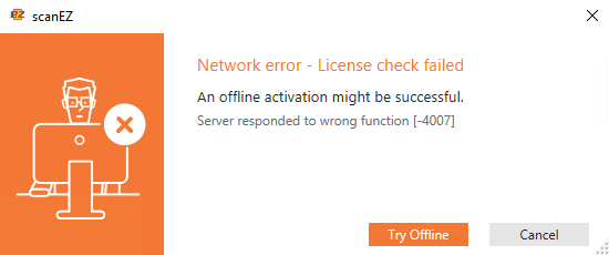 If the product encounters any network issue when using the Online registration, you will get the following dialog where you can ask to try the Offline approach: