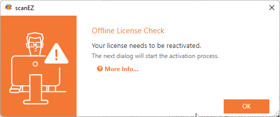 When the offline license lease expires, you will get the following dialog telling you that you need to reactivate your offline license: