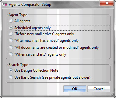 After making your selection and choosing the 'Compare Agents' option, you'll see this dialog. Here you can choose both the type of agents to compare (all agents; scheduled agents only; 'before new mail arrives' agents only; 'all documents are created or modified' agents only; or 'when server stars' agents only), and the method of searching (the faster 'design collection note' search; or the slower 'basic search' which can show private agents).